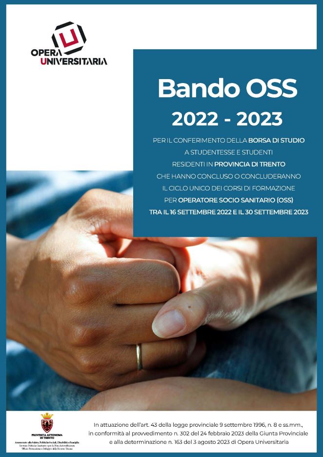 È stata approvata la graduatoria per il conferimento della borsa di studio a studentesse e studenti residenti in provincia di Trento che hanno concluso il ciclo unico dei corsi di formazione per operatore socio sanitario (OSS) tra il 16 settembre 2022 e il 30 settembre 2023.
