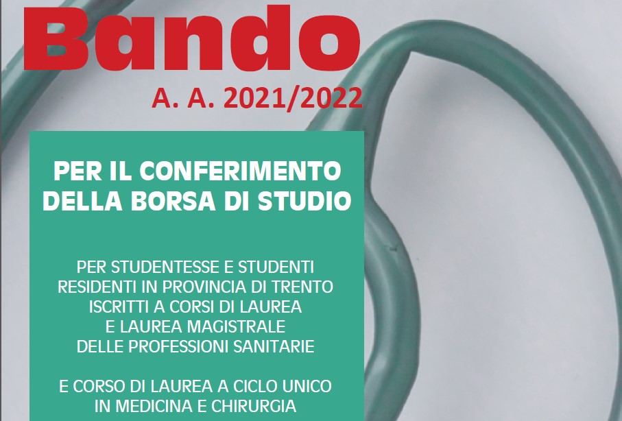 È stato approvato il Bando per il conferimento della borsa di studio alle studentesse e agli studenti residenti in provincia di Trento iscritti a corsi di laurea e laurea magistrale delle professioni sanitarie e al corso di laurea a ciclo unico in Medicina e Chirurgia per l’a.a. 2021/2022.