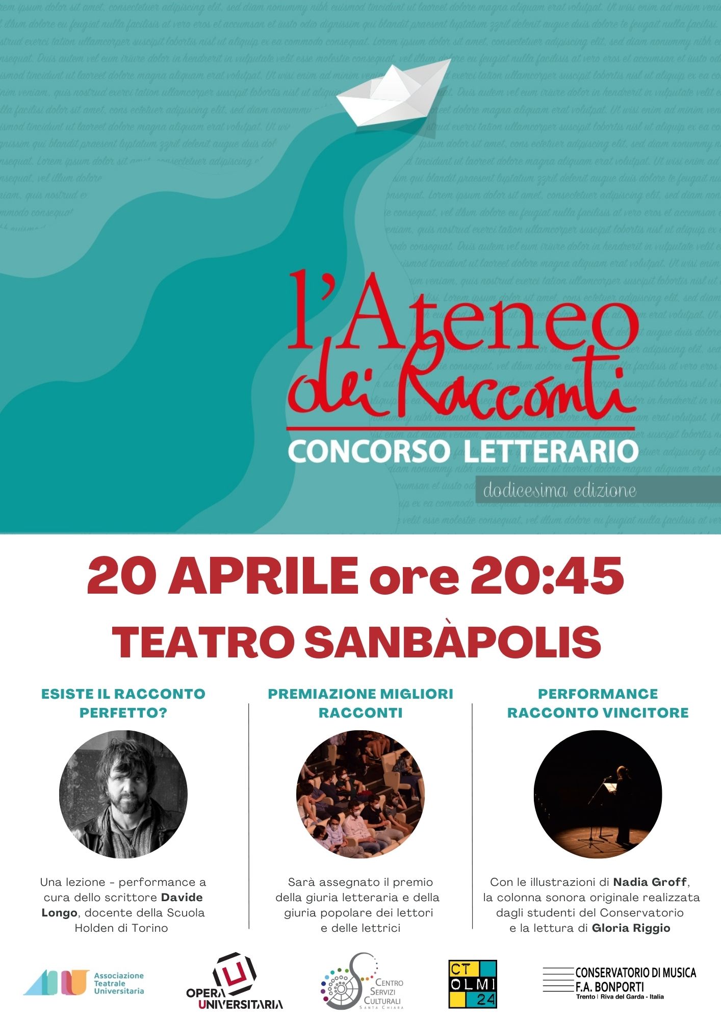 Prosegue il percorso di Ateneo dei racconti, il concorso letterario organizzato da Opera Universitaria in collaborazione con il Centro Servizi Culturali Santa Chiara, l’Associazione Teatrale Universitaria ATU, il Conservatorio di Musica F.A. Bonporti e il CT Olmi 24, giunto alla dodicesima edizione.